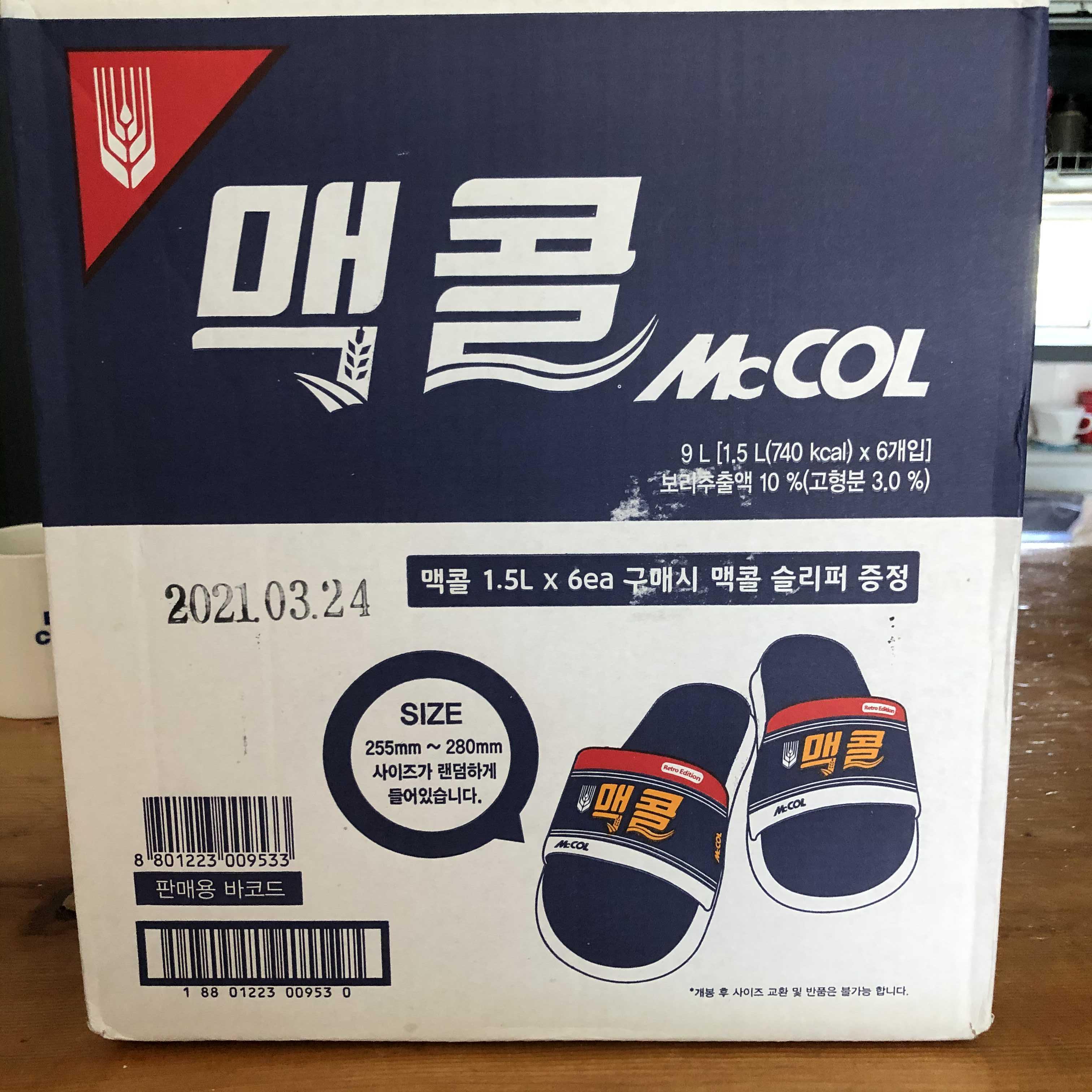 맥콜 1.5리터 패트병 6개가 포장된 박스와 한정판 맥콜 슬리퍼가 들어있는 박스가 에어캡 포장으로 꼼꼼히 포장되서 배송되어 왔습니다.