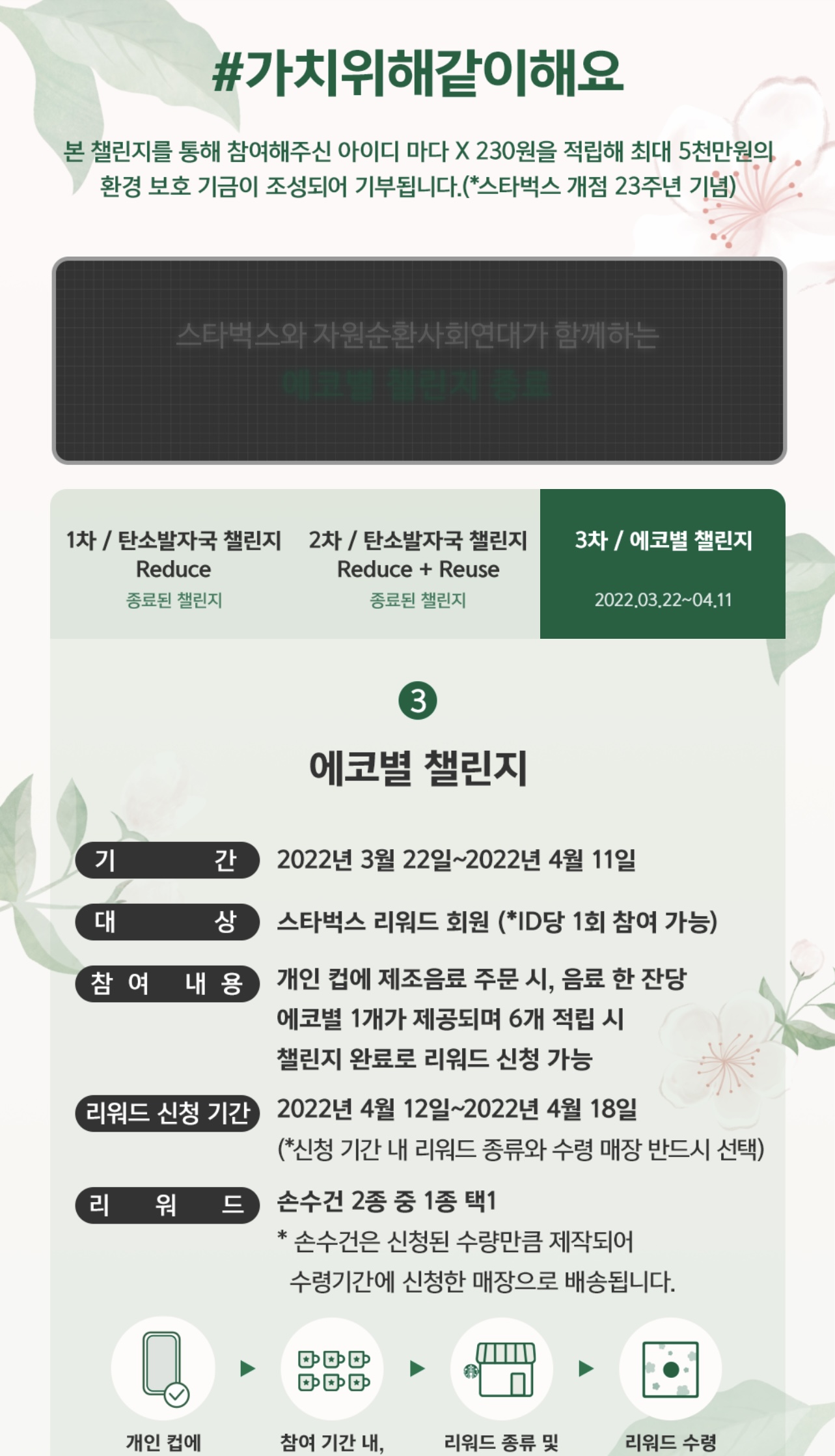 스벅에서 진행되는 이벤트는 가끔 너무 도가 지나칠 때가 있는데 이런 에코별 챌린지 같은 행사는 취지도 너무 좋고 참여하는데도 의미있고 사은품도 받으니 기분도 너무 좋고 자주자주 해주셨으면 좋겠어요.