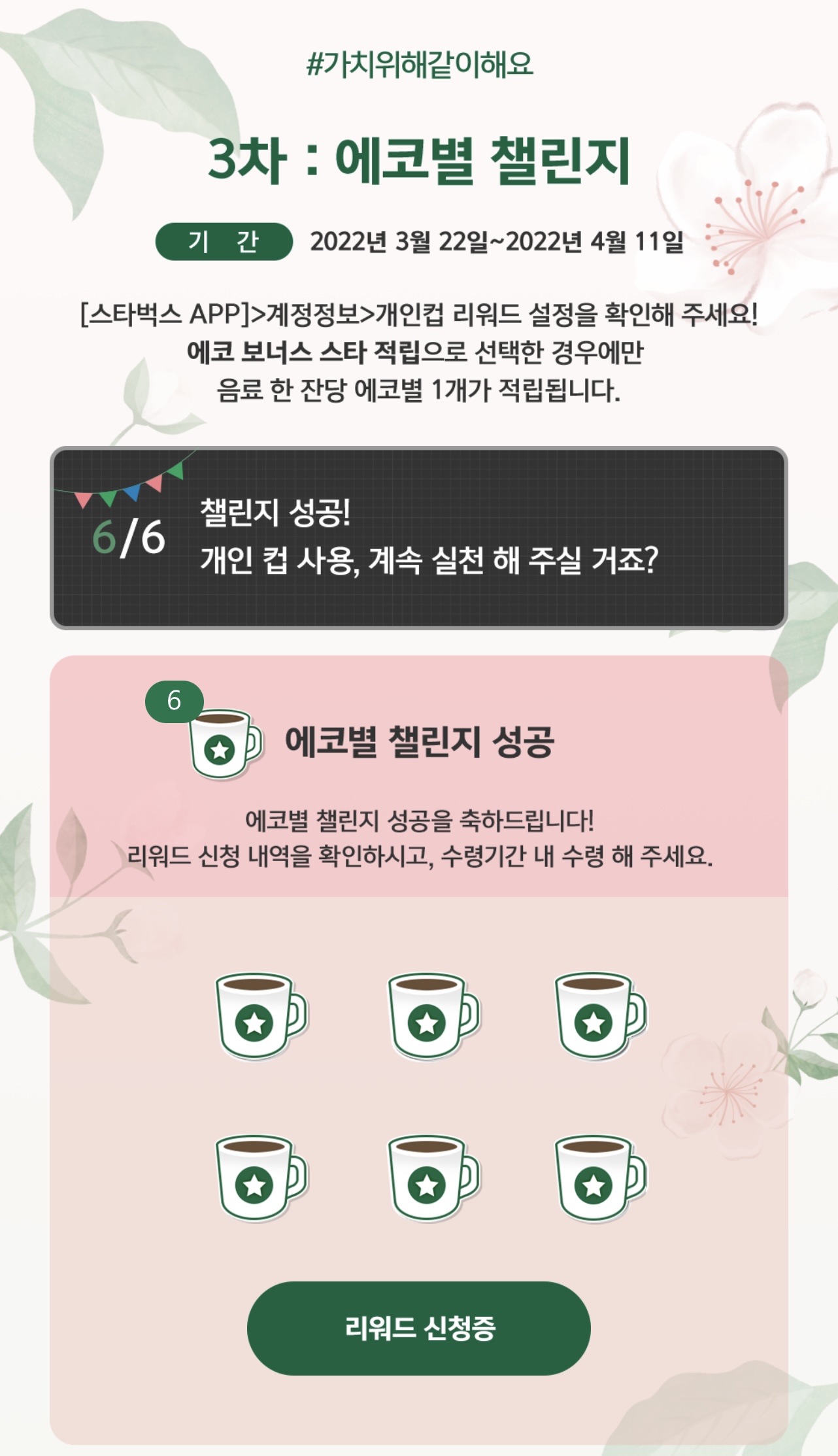이렇게 스벅컵 모양의 스탬프가 6개 모이면 성공입니다.